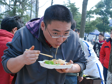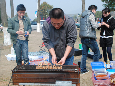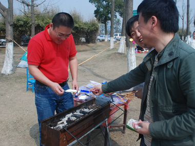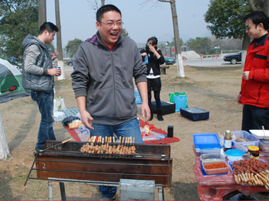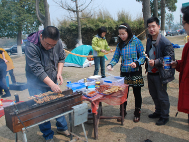 9:30分左右,一行20余人分乘兩輛車到達(dá)目的地太湖濕地公園;勘地、搭帳篷、支燒烤爐子,20分鐘內(nèi)全部搞定,勤勞的女同志串肉串等,向咱們既漂亮又賢惠的女同胞們致敬;男同志則為保持戰(zhàn)斗力,在帳篷內(nèi)休整——打牌;放圖與各位一同分享。